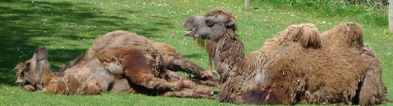 The one humped camel, dressed up for human transportation (left) and the two-humped camel relaxing on the grass at a zoo. (below)
