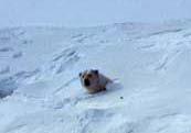 This picture shows a mother polar bear coming up from her maternity snow den.
