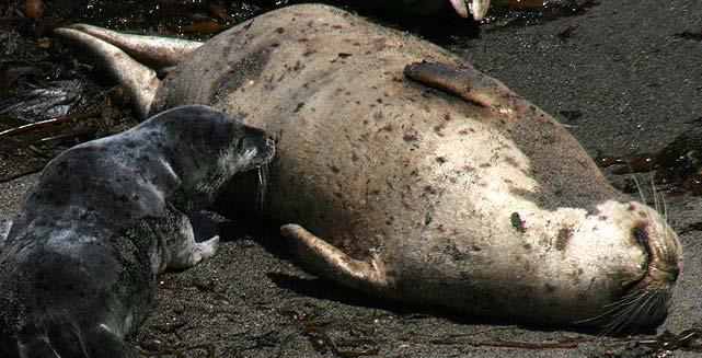 A baby harbor seal nurses from its mother.